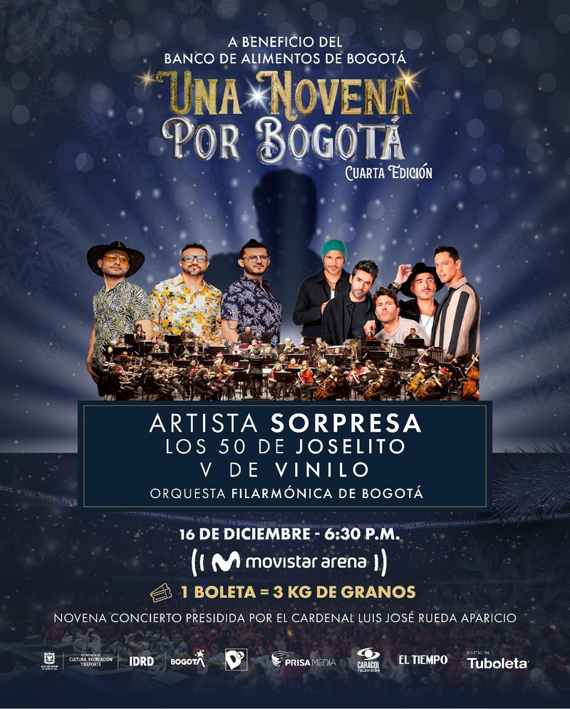 Vuelve Una Novena por Bogotá, un evento con sello único, que surge desde la generosidad y lo entrega todo. El 100% de lo recaudado llega directamente a los beneficiarios del Banco de Alimentos de Bogotá.El próximo 16 de diciembre, la fe, la música y la generosidad se unen por cuarto año consecutivo en una misma causa. La Novena será presidida por el Cardenal Luis José Rueda Aparicio y reunirá a la Orquesta Filarmónica de Bogotá, Los 50 de Joselito, V de Vinilo y a un gran invitado sorpresa que hará de esta una celebración navideña única.Compra tu boleta aquí o acércate a uno de los puntos D1 seleccionados y canjea tu entrada por tres kilos de granos.